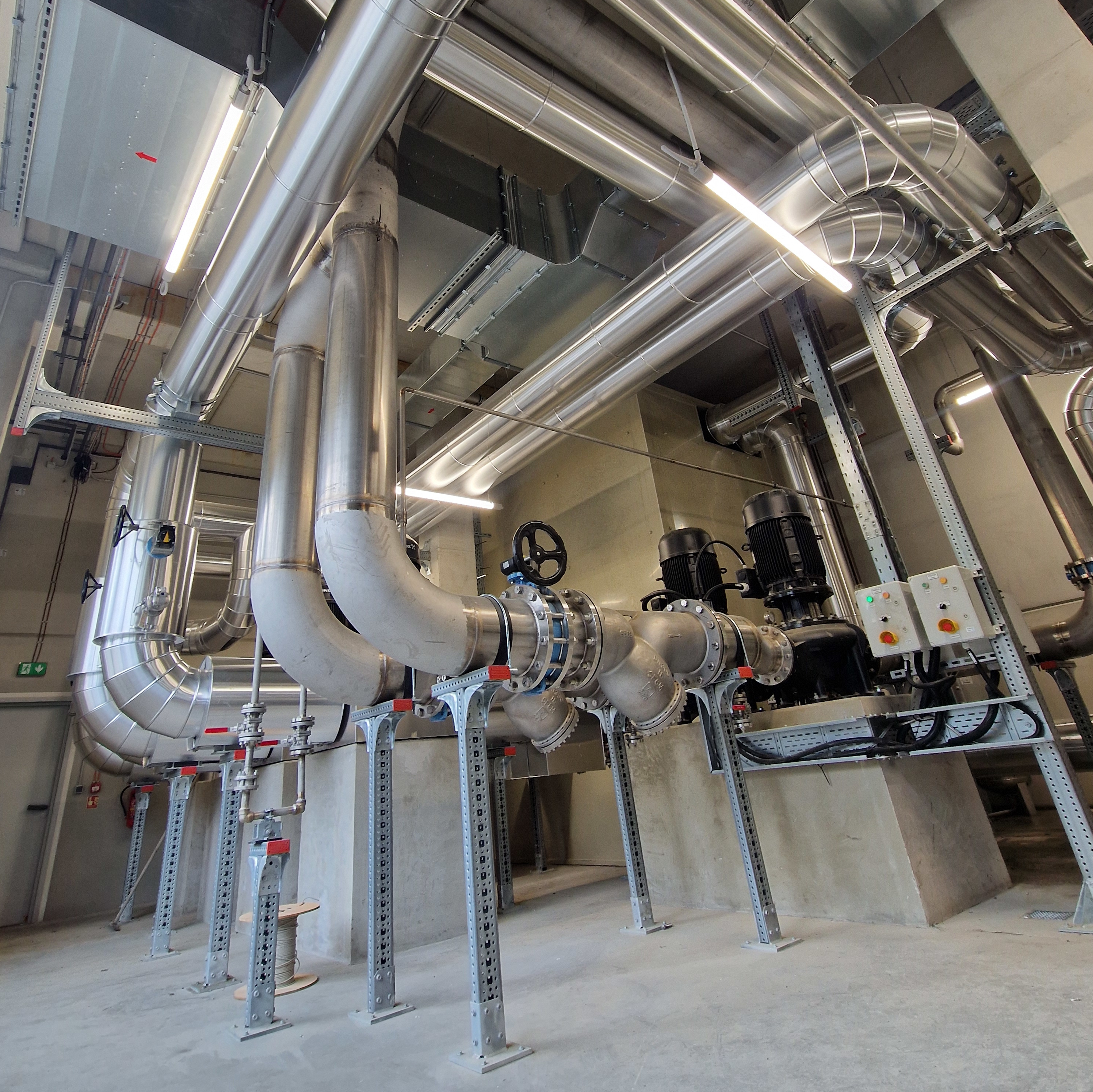 Kompletná dodávka a montáž potrubia, podpery potrubí, nosníkov potrubia, armatúry, čerpadlá (čerpadlo chladiacej veže 45 °C, čerpadlo teplej vody 45 °C, výmenník tepla), nádrže (zásobník teplej vody 20 m³, zásobník chladenej vody 60 m³, materiál PP-C), ventilov a spojovacích materiálov, doprovodného vykurovania.